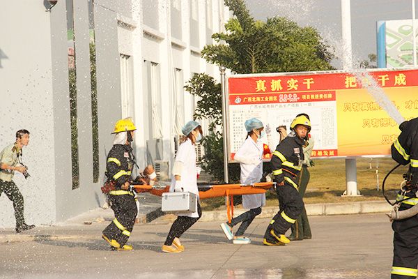 下午16:00點(diǎn)整,一聲急促的警報(bào)拉開(kāi)了此次演練活動(dòng)的帷幕。“火情”從辦公大樓三層某辦公室起火,火勢(shì)燃燒猛烈并迅速向四周蔓延,情況危急。中國(guó)電子北海產(chǎn)業(yè)園立即啟動(dòng)《滅火應(yīng)急疏散預(yù)案》,滅火救援行動(dòng)組、現(xiàn)場(chǎng)警戒組、技術(shù)保障組、疏散引導(dǎo)組、通訊聯(lián)絡(luò)組、醫(yī)療救護(hù)組立即投入各自崗位,組織疏散樓內(nèi)人員,利用室內(nèi)消火栓進(jìn)行滅火,并隨即撥打119報(bào)警。員工紛紛拿起了自備的濕毛巾,捂著口鼻,沿著廠房疏散通道迅速有序的離開(kāi)“火災(zāi)現(xiàn)場(chǎng)”到達(dá)安全地帶。5分鐘后,北海市消防支隊(duì)特勤中隊(duì)消防官兵到達(dá)現(xiàn)場(chǎng),經(jīng)偵查,發(fā)現(xiàn)火勢(shì)起火點(diǎn)在三樓的展廳并且燃燒猛烈,大量煙霧竄至樓外,有人員被困樓頂。指揮員立即匯報(bào)并下達(dá)搜救命令。搜救小組由大樓正門(mén)進(jìn)入,從三樓至一樓進(jìn)行搜救,利用擔(dān)架將受傷員工轉(zhuǎn)移到救護(hù)車上。救援小組利用云梯車將被困樓頂?shù)膯T工成功營(yíng)救到地面。在消防隊(duì)員的強(qiáng)攻下,火勢(shì)及時(shí)得到控制。整個(gè)演練過(guò)程指揮得當(dāng)、操作規(guī)范、緊張有序。