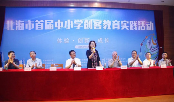 北海市科技局、北海市教育局、中國電子學(xué)會、中國電子北海產(chǎn)業(yè)園主辦的2018年北海市科技活動周暨首屆中小學(xué)創(chuàng)客教育實踐活動于5月21日開幕,北海市副市長黃江出席開幕式并宣布教育實踐活動啟動。