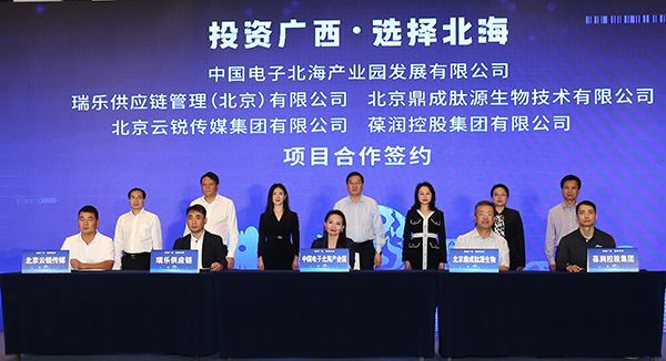在北海市委書(shū)記蔡錦軍,市委常委、常務(wù)副市長(zhǎng)譚秀洪,市委常委、秘書(shū)長(zhǎng)鄭定雄,經(jīng)開(kāi)區(qū)管委會(huì)主任劉忠廣,中國(guó)電子北海產(chǎn)業(yè)園公司執(zhí)行董事徐俊男,長(zhǎng)江商學(xué)院老師徐汀、長(zhǎng)江商學(xué)院老師許耀公的見(jiàn)證下,中國(guó)電子北海產(chǎn)業(yè)園發(fā)展有限公司與北京云銳傳媒集團(tuán)有限公司、北京鼎成肽源生物技術(shù)有限公司、瑞樂(lè)供應(yīng)鏈管理(北京)有限公司、葆潤(rùn)控股集團(tuán)有限公司簽署合作協(xié)議。